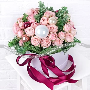 Новогодняя романтика - коробка с розовыми розами и эустомой