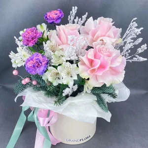 Зимняя нежность - коробка с розами, диантусами, альстромериями