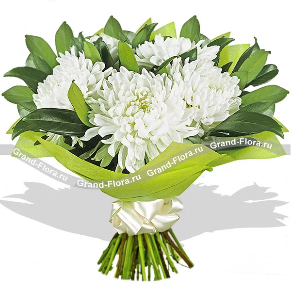 Элегантный букет из белых хризантем - это классическое цветочное произведение, которое никогда не потеряет своей актуальности и всегда будет радовать изысканной и такой нежной красотой.