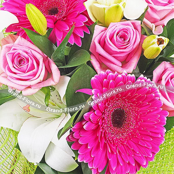Шикарная композиция состоит из нежных розовых роз, выразительных малиновых гербер и утонченных белых лилий. Цветочное трио выгодно подчеркивает рускус и зеленая декоративная обертка из сетки.