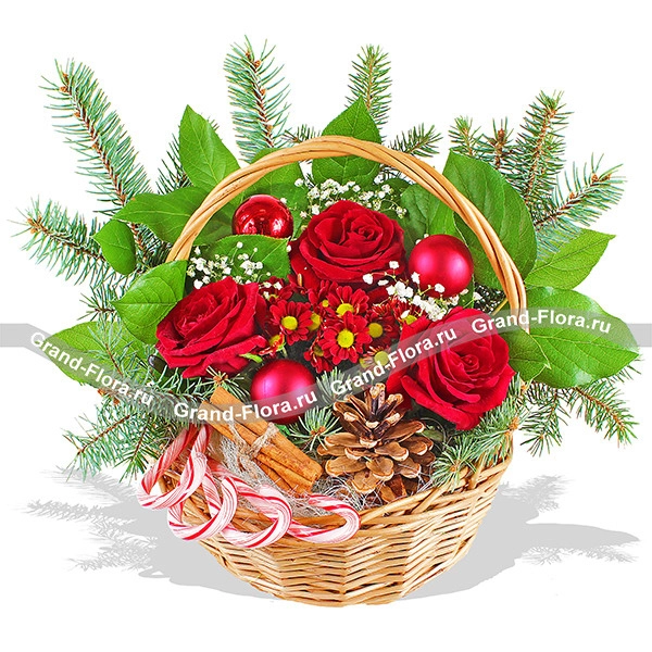 Стандартный: роза красная - 3шт., хризантема красная ромашковидная кустовая - 2шт., рождественские леденцы - 5шт., гипсофила, декоративная зелень, еловая ветвь, корица, новогодний декор, оазис, средняя корзина.