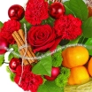 ДЕЛЮКС: гвоздика - 9шт., роза красная - 3шт., хризантема зеленая (сантини) - 3шт., корица, мандарины - 2кг., конфеты "Родные просторы" (278 г.) - 1шт., еловая ветвь - 2шт., новогодний декор и зелень, желтый фетр, оазис, корзина средняя.