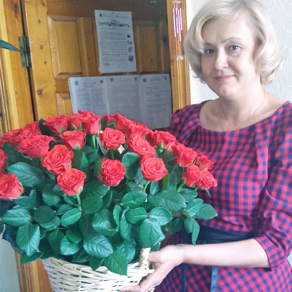 Выбрали 51 розу. Заказали доставку по случаю юбилея нашего руководителя и очень рады что выбрали именно эту компанию! Все соответствует фото на сайте: светлая корзина и отменные, крупные красные розы.