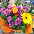 Стандартный (на фото): хризантема кустовая ромашковая (фиолетовая) - 3 шт, гербера желтая - 3 шт, роза кустовая оранжевая/розовая - 1 шт (в центре), рускус или салал, фетр оранжевый. Примерный размер: 25Х25 см.