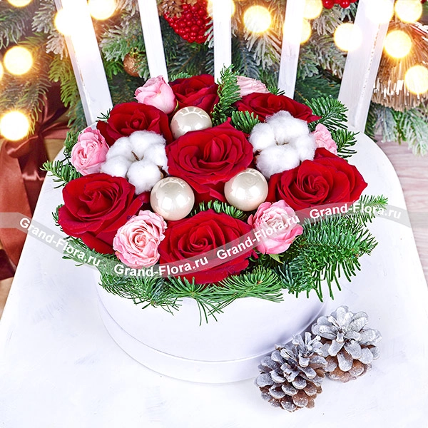 Стандартный: роза красная - 7 шт., роза кустовая розовая - 2 шт., хлопок - 2 шт., шарики - 3 шт., ель, оазис, коробка.