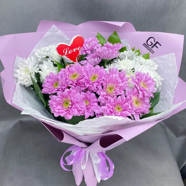 5 хризантем: хризантема кустовая белая - 3 шт., хризантема кустовая розовая  - 2 шт.,  декор сердечко , упаковка, лента